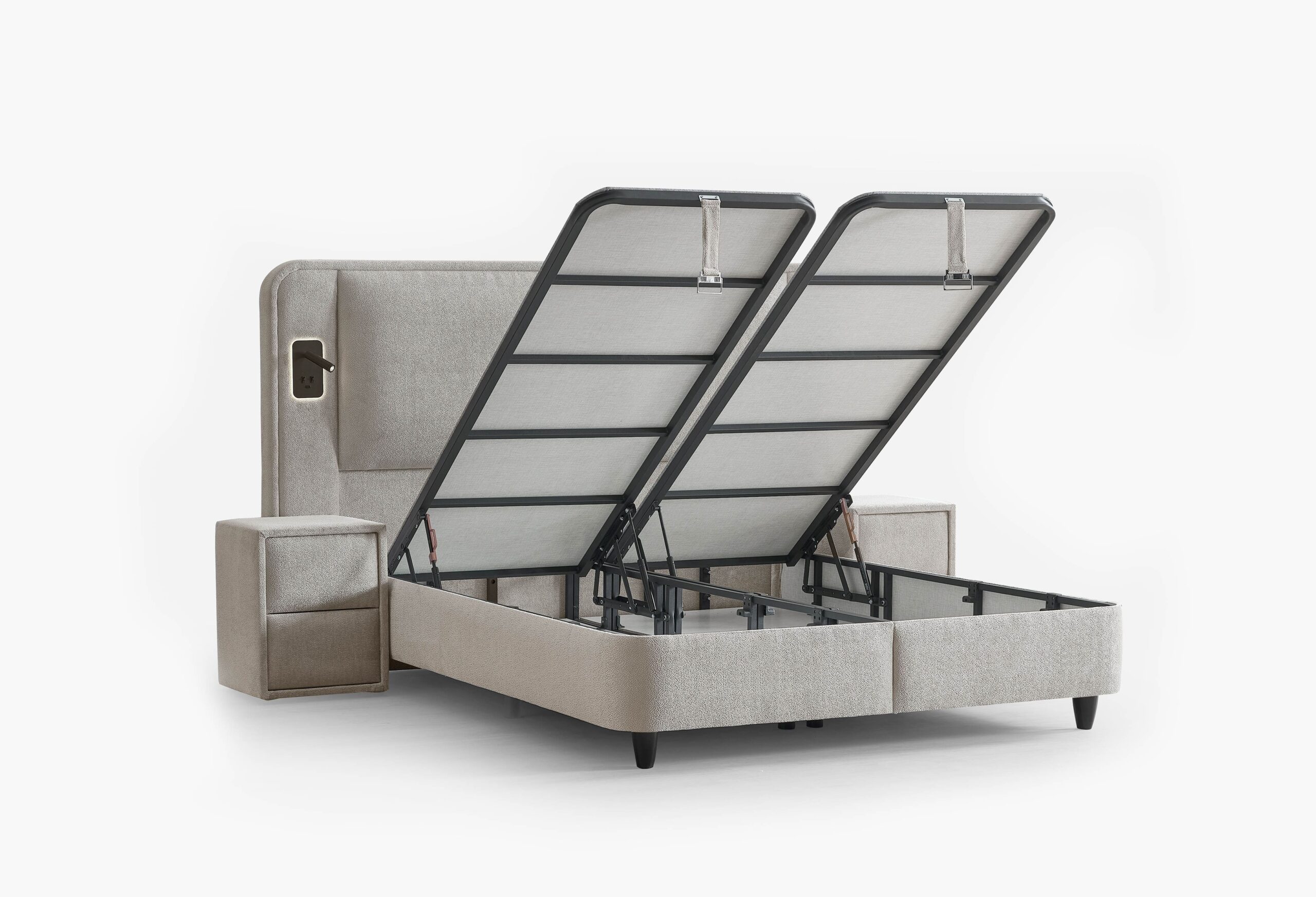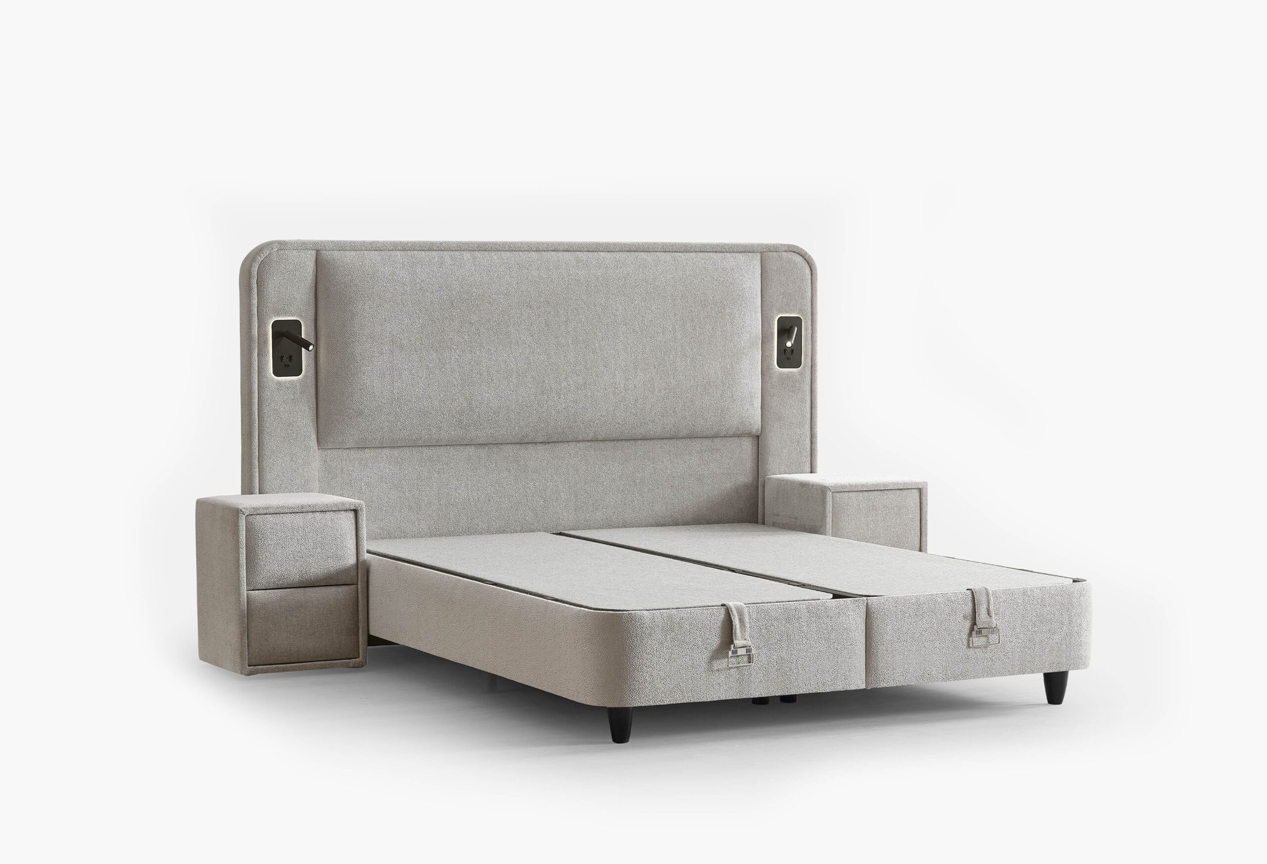 Om de set compleet te maken, is de boxspring ook verkrijgbaar met twee bijpassende nachtkastjes. Deze stijlvolle meubelstukken sluiten perfect aan op het ontwerp van het hoofdbord en bieden voldoende ruimte voor een nachtlampje, boeken of persoonlijke items. Ze combineren functionaliteit met een elegant design en zorgen ervoor dat alles wat je nodig hebt binnen handbereik blijft.