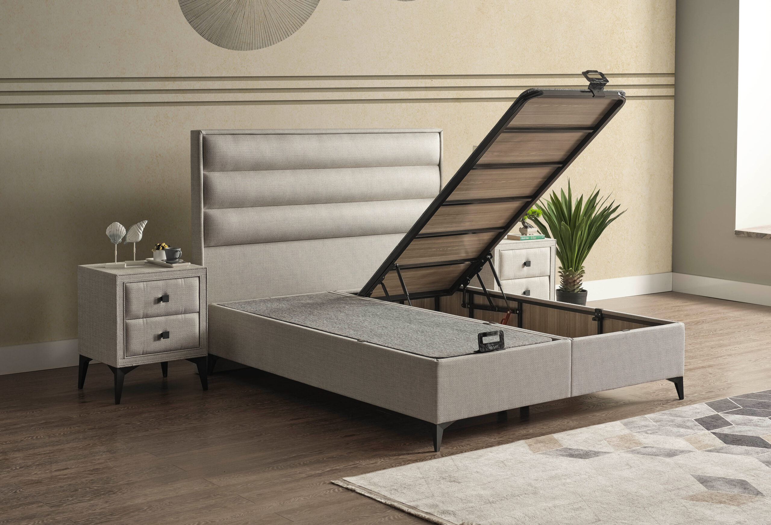 Boxspring Moon is verkrijgbaar in de maten 140×200, 160×200 cm en 180×200 cm en biedt een uitmuntende ligcomfort dat ideaal is voor een goede nachtrust. Maar dat is niet alles; deze premium boxspring kan geleverd worden met 2 bijpassende nachtkastjes en heeft een opbergruimte onder het matrasgedeelte. Hierdoor kan je gemakkelijk en discreet al je extra beddengoed, kussens of andere slaapkamerbenodigdheden kunt opbergen. Geen gedoe meer met overvolle kasten of rommelige hoeken. Met Boxspring Moon houdt je de slaapkamer netjes en georganiseerd.