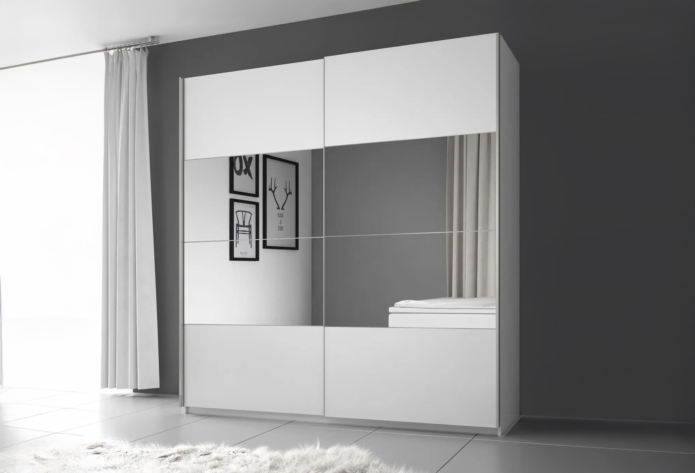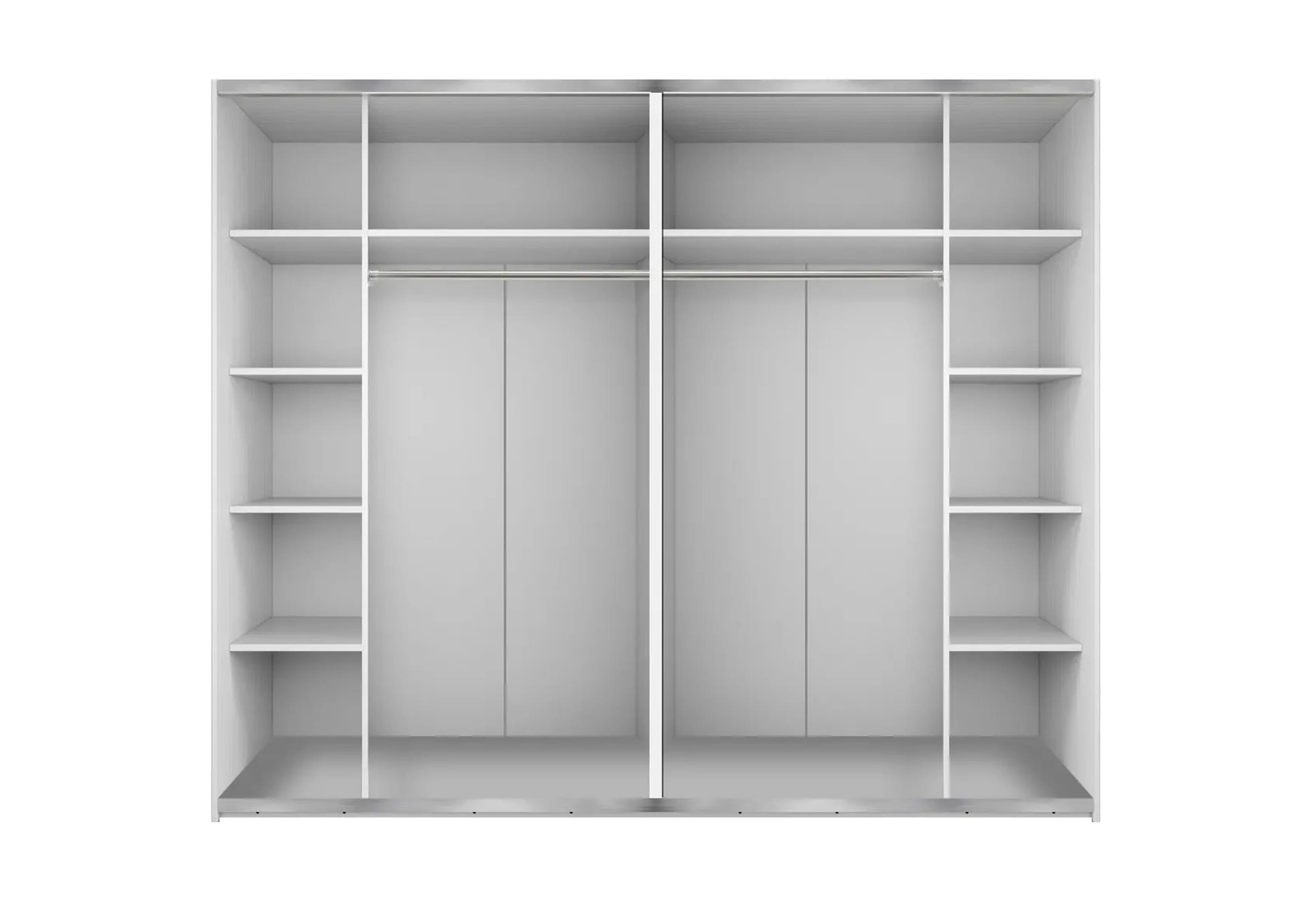 De garderobekast Lina is een moderne en praktische kast uitgevoerd in een witte kleur. Door het toepassen van 2 schuifdeuren heeft de garderobekast weinig ruimte nodig. Dit maakt het meubel passend voor elke stijl slaapkamer in ieder formaat. Op beide schuifdeuren is een grote spiegel geplaatst welke de slaapkamer optisch groter doet lijken, maar vooral erg handig is. Het binnenwerk bestaat aan de rechterhelft uit 4 schappen en aan de linkerkant een grote opbergruimte met metalen stang om kleding aan op te hangen. Bovenin zijn twee brede schappen geplaatst om bijvoorbeeld schoenen en accessoires op te bergen. Kortom; kledingkast Lina is een praktische, mooi vormgegeven kast en beschikt over voldoende opbergruimte. De getoonde vaste en scherpe prijs is voor het meubel zoals afgebeeld. Dat betekent dus compleet met binnenwerk en spiegel.