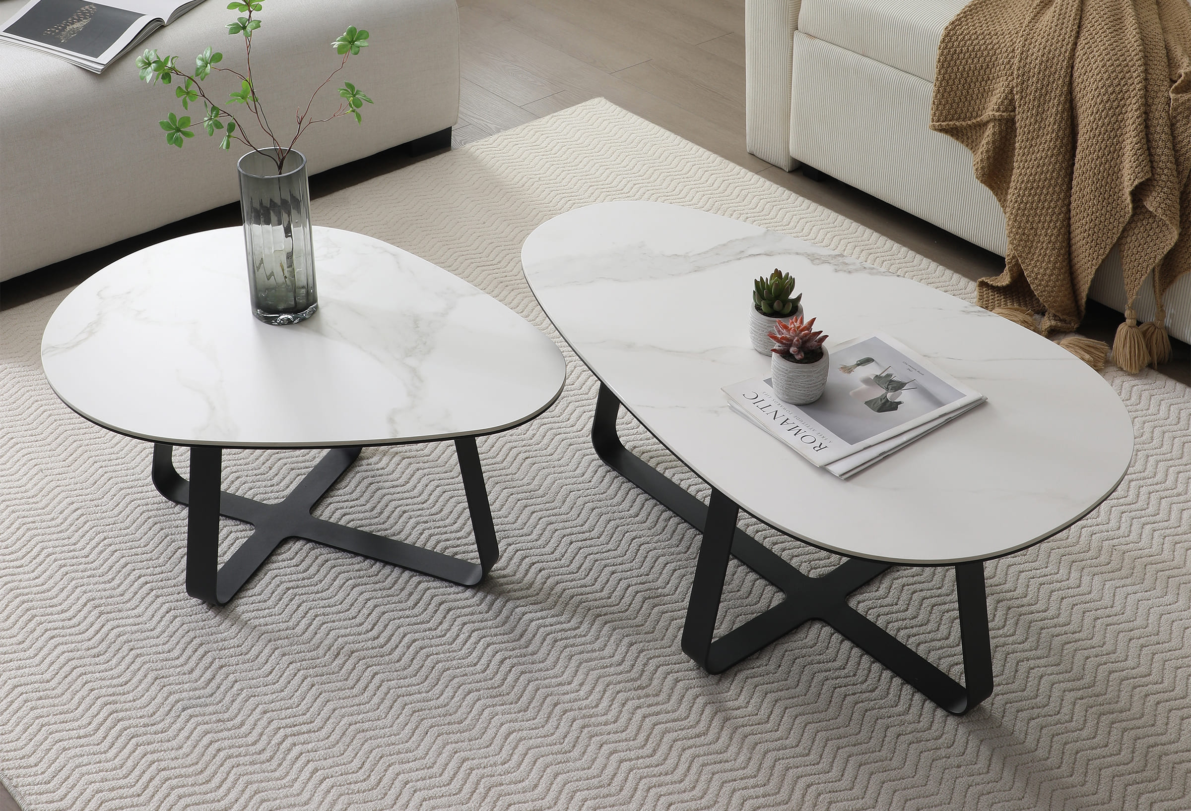 Het tafelblad van Armani salontafel-set is een meesterwerk op zichzelf. Gemaakt van een laag van 6 mm travertijn keramiek, die de natuurlijke schoonheid en luxe uitstraling van travertijn nabootst, aangevuld met 6 mm gehard glas voor extra sterkte en duurzaamheid. Dit samenspel van materialen zorgt voor een oppervlak dat zowel praktisch als elegant is.